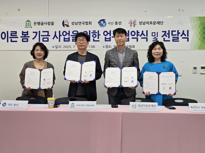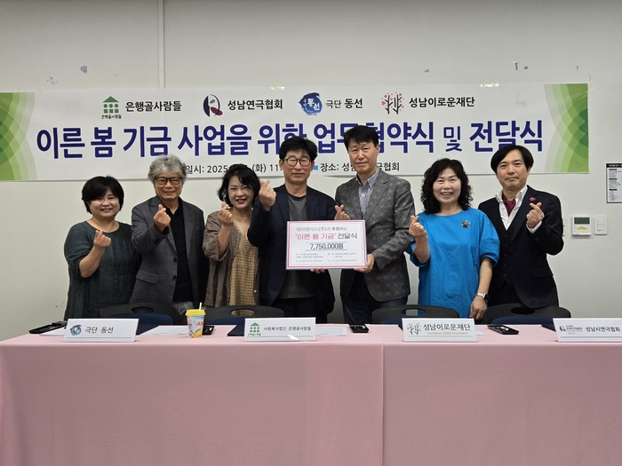 이번 협약은 성남이로운재단과 함께 (사)은행골사람들, 성남시연극협회, 극단 동선이 참여했으며, 케이엠시스 주식회사는 ‘이른 봄 기금’ 시범사업으로 총 775만 원을 기부했다.